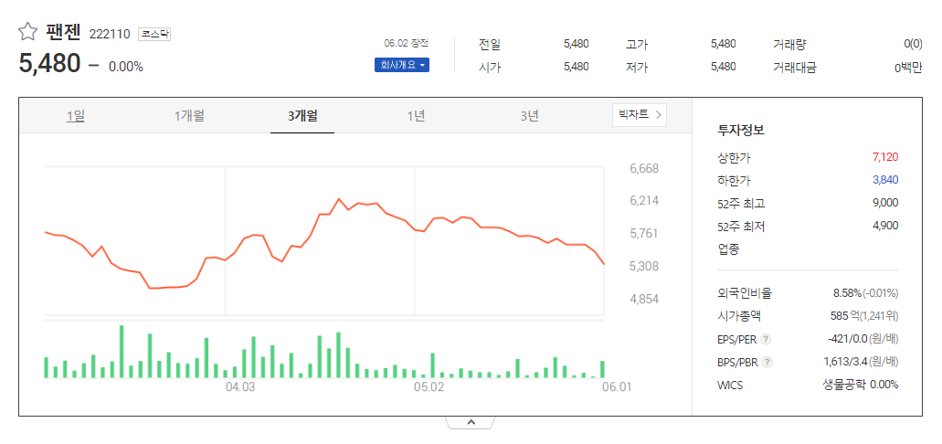 이 글에서는 팬젠 주가 전망과 목표 주가, 기업 정보에 대해서 설명합니다. 주식 투자에 앞서 기업 주가와 재무 현황표에 대해서 분석하는 것이 필요합니다. 팬젠 주식의 주요 현황과 투자 정보를 확인하시고 주가 현황을 시장에 맞춰서 분석해보겠습니다.