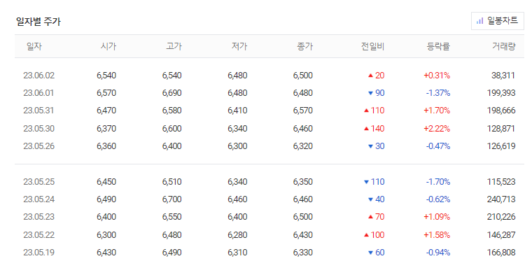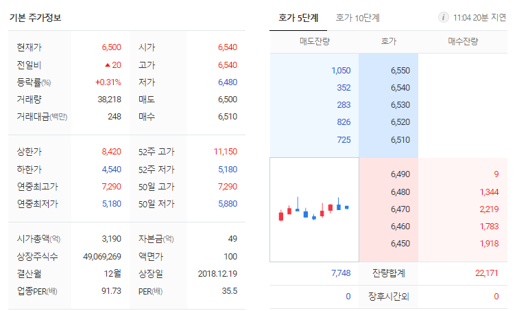 국전약품 현재 주가는 6,480원이며 전일 대비 -90원의 모습을 보이고 있습니다. 국전약품의 주주현황을 살펴보면 홍종호(외 7인)이 지분 61.99%를 소유하고 있습니다. 국전약품는 제약 기업으로 장중 기준으로 주가는 6,480원 입니다. 삼성전자의 시가 총액은 3180억 원이며 발행 주식수는 0.36주 입니다. 외국인 보유 비중은 199,393% 이며 장중 거래량은 49,069,269를 기록했습니다. 매출액은 319억 원, 영업이익은 35억 원을 달성했습니다. EPS는 없음원이며 국전약품 주식 배당수익률은 0.65% 입니다.