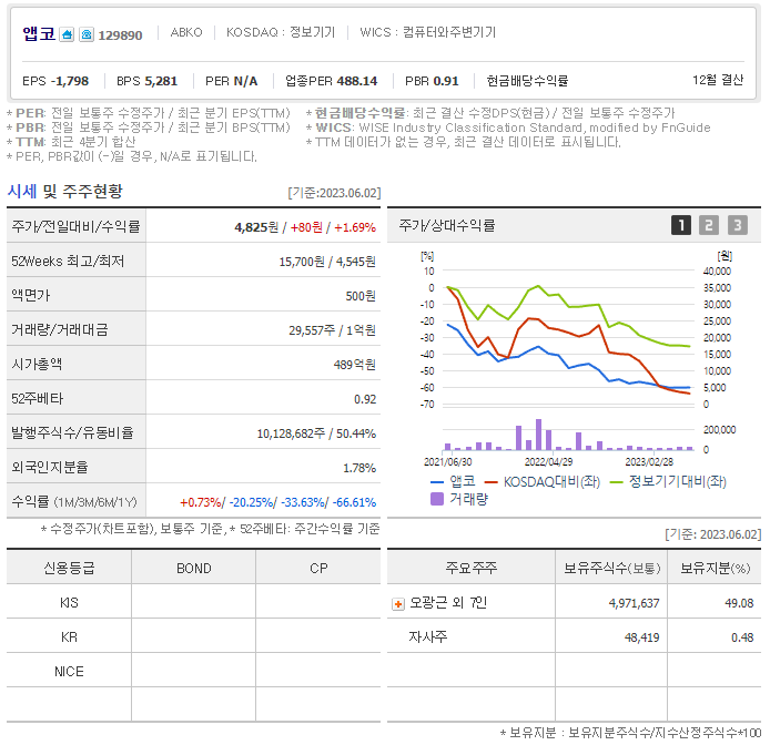 앱코 현재 주가는 4,825원이며 전일 대비 -20.25원의 모습을 보이고 있습니다. 앱코의 주주현황을 살펴보면 오광근(외 7인)이 지분 49.08%를 소유하고 있습니다. 앱코는 컴퓨터 및 주변기기 기업으로 장중 기준으로 주가는 4,825원 입니다. 삼성전자의 시가 총액은 497억 원이며 발행 주식수는 1.77주 입니다. 외국인 보유 비중은 29,557% 이며 장중 거래량은 10,128,682를 기록했습니다. 매출액은 280억 원, 영업이익은 -154억 원을 달성했습니다. EPS는 없음원이며 앱코 주식 배당수익률은 1,018% 입니다.