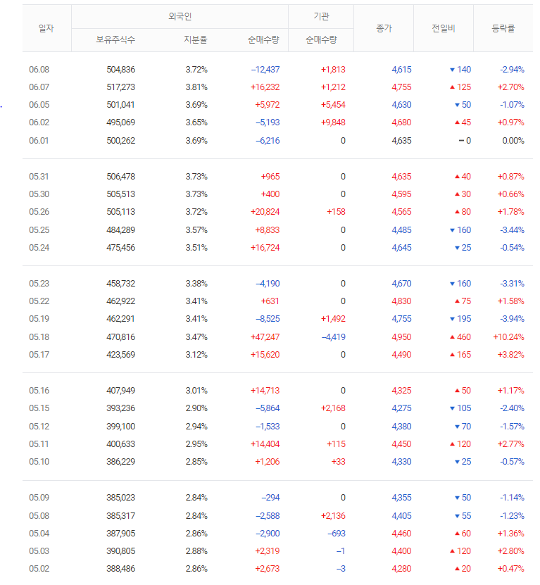 그렇기에 개인 매수 세력은 외국인이나 기관 투자자를 따라가는 방법밖에 없습니다. 세력이 약한 개인 투자자는 기관과 외국인의 매수 현황을확인하고 수익을 낼 수 있습니다. 최근 흐름은 외국인 보다 기관의 흐름을 따라가는 경우가 많습니다. 외국인은 속임수를 많이 쓰고 개인 투자자들이 원하는 단기 투자는 기관의 투자와 맞기 때문입니다.