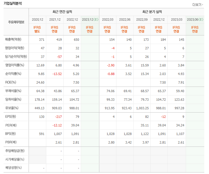 -2022년 12월 전년동기 대비 연결기준 매출액은 55.2% 증가, 영업이익은 13.3% 증가, 당기순이익 흑자전환. 종속회사 편입으로 매출액 증가하였으며, 직전사업연도 SPAC합병 상장에 따른 합병비용이 일시적으로 계상되었음. 원가 절감 및 생산성 향상을 통해 가격 경쟁력을 낮추는 전략을 취하는 중임. 코로나로 위축되었던 해운시장 및 선박발주량이 회복세를 보임에 따라 환경장비 및 의장재 수요가 증가하는 중.