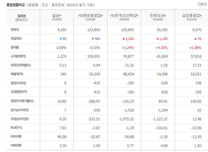일승 현재 주가는 4,250원이며 전일 대비 -35원의 모습을 보이고 있습니다. 일승의 주주현황을 살펴보면 세진중공업(외 5인)이 지분 74.56%를 소유하고 있습니다. 일승는 조선 기업으로 장중 기준으로 주가는 4,250원 입니다. 삼성전자의 시가 총액은 1294억 원이며 발행 주식수는 0.13주 입니다. 외국인 보유 비중은 17,823,076% 이며 장중 거래량은 30,726,747를 기록했습니다. 매출액은 145억 원, 영업이익은 32억 원을 달성했습니다. EPS는 없음원이며 일승 주식 배당수익률은 5% 입니다.
