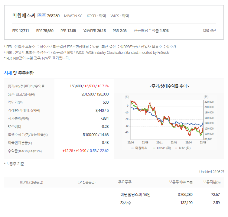 미원에스씨 현재 주가는 153,600원이며 전일 대비 -0.58원의 모습을 보이고 있습니다. 미원에스씨의 주주현황을 살펴보면 미원홀딩스(외 36인)이 지분 72.67%를 소유하고 있습니다. 미원에스씨는 화학 기업으로 장중 기준으로 주가는 153,600원 입니다. 삼성전자의 시가 총액은 7854억 원이며 발행 주식수는 0.48주 입니다. 외국인 보유 비중은 3,440% 이며 장중 거래량은 5,100,000를 기록했습니다. 매출액은 1,109억 원, 영업이익은 809억 원을 달성했습니다.미원에스씨 주식 배당수익률은 855% 입니다.