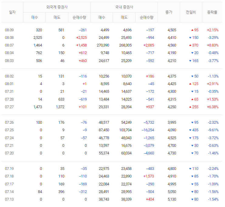 물론 가장 좋은 경우는 기관과 외국인이 같이 매수하는 쌍끌이 종목을 살펴보는 것입니다. 기관과 외국인이 동시에 매수한다는 뜻은 투자하기 좋다는 뜻입니다. 해당 종목의 주가 전망을 분석하기 위해서는 기업체 상태를 분석하고 시장에서의 위치를 분석해야 합니다. 그리고 기관과 외국인 매수 흐름까지 살펴본다면 성공 확률을 올릴 수 있습니다.