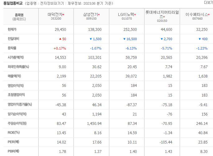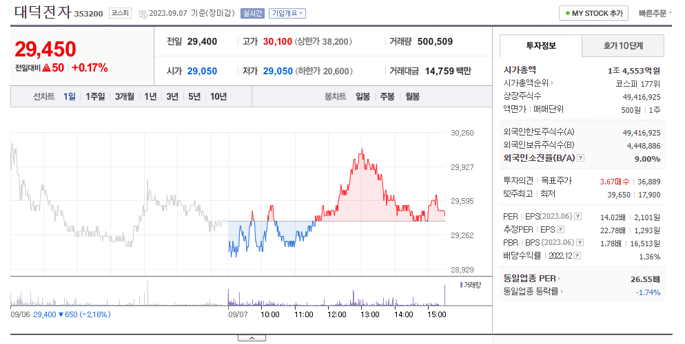 대덕전자 현재 주가는 29,400원이며 전일 대비 -650원의 모습을 보이고 있습니다. 대덕전자의 주주현황을 살펴보면 대덕(외 7인)이 지분 32.81%를 소유하고 있습니다. 대덕전자는 전자 장비 및 기기 기업으로 장중 기준으로 주가는 29,400원 입니다. 삼성전자의 시가 총액은 1조4578억 원이며 발행 주식수는 9.00주 입니다. 외국인 보유 비중은 603,720% 이며 장중 거래량은 49,416,925를 기록했습니다. 매출액은 4,375억 원, 영업이익은 2,325억 원을 달성했습니다. EPS는 1,293원이며 대덕전자 주식 배당수익률은 2.12% 입니다.