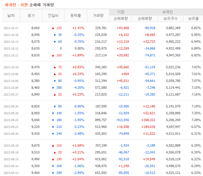 그렇기에 개인 투자자는 기관이나 외국인 세력을 따라가며, 세력이 약한 상태에서도 투자로 수익을 내는 것이 가능합니다. 최근, 외국인보다 기관 투자자를 따르는 흐름이 강해졌으며, 외국인의 매수가 불안정하고 개인의 단기 거래가 기관과 유사한 패턴 때문입니다.