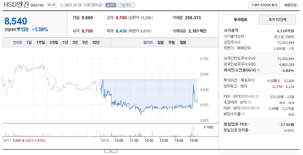 HSD엔진 현재 주가는 8,660원이며 전일 대비 -8.75원의 모습을 보이고 있습니다. HSD엔진의 주주현황을 살펴보면 인화정공(외 2인)이 지분 33.24%를 소유하고 있습니다. HSD엔진는 조선 기업으로 장중 기준으로 주가는 8,660원 입니다. 시가 총액은 6110억 원이며 발행 주식수는 6.82주 입니다. 외국인 보유 비중은 329,781% 이며 장중 거래량은 71,543,994를 기록했습니다. 매출액은 3,884억 원, 영업이익은 -295억 원을 달성했습니다. EPS는 363원입니다.