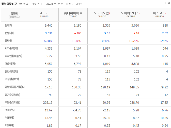 -동사는 2017년 11월 '에이치씨에이에스 주식회사'로 설립되었으며, 2021년 3월 '케이카 주식회사'로 상호변경함. 국내 중고차 시장 내 매출 규모 1위의 매매업체임. CPO 모델을 기반으로 이커머스 플랫폼과 전국적인 오프라인 매입 및 판매 네트워크를 직영 구조로 운영하고 있음. 2023년 2분기 기준 동사의 중고차 판매 대수는 36천대로, 전체 중고차 시장 내 5.6%의 시장점유율을 유지함.
