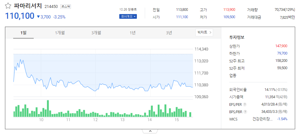 파마리서치 현재 주가는 113,800원이며 전일 대비 -5.09원의 모습을 보이고 있습니다. 파마리서치의 주주현황을 살펴보면 정상수(외 9인)이 지분 38.92%를 소유하고 있습니다. 파마리서치는 의료 장비 및 서비스 기업으로 장중 기준으로 주가는 113,800원 입니다. 파마리서치 시가 총액은 1조1344억 원이며 발행 주식수는 14.11주 입니다. 외국인 보유 비중은 54,479% 이며 장중 거래량은 10,312,470를 기록했습니다. 매출액은 1,222억 원, 영업이익은 659억 원을 달성했습니다. EPS는 7,058원이며 파마리서치 주식 배당수익률은 0.96% 입니다.