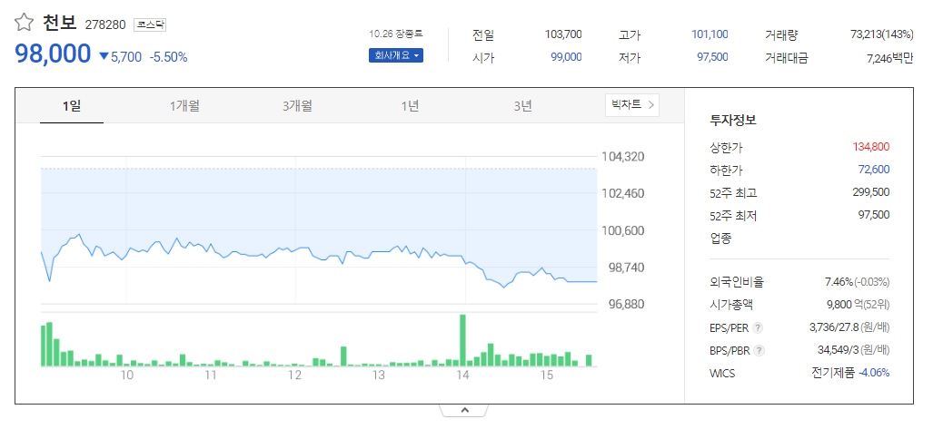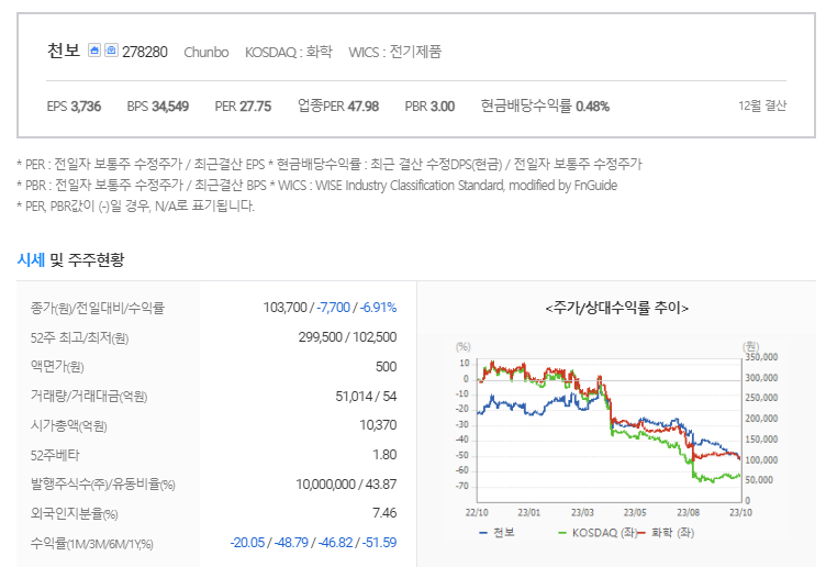 천보 현재 주가는 103,700원이며 전일 대비 -7,700원의 모습을 보이고 있습니다. 천보의 주주현황을 살펴보면 이상율(외 11인)이 지분 55.43%를 소유하고 있습니다. 천보는 전자 장비 및 기기 기업으로 장중 기준으로 주가는 103,700원 입니다. 천보 시가 총액은 9850억 원이며 발행 주식수는 7.46주 입니다. 외국인 보유 비중은 51,014% 이며 장중 거래량은 10,000,000를 기록했습니다. 매출액은 943억 원, 영업이익은 565억 원을 달성했습니다. EPS는 -1,260원이며 천보 주식 배당수익률은 10,370% 입니다.
