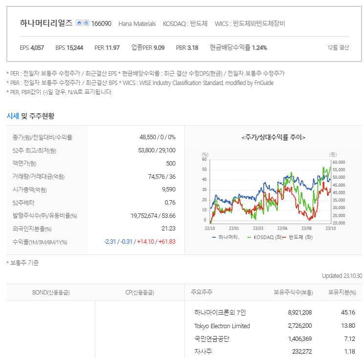 하나머티리얼즈 현재 주가는 48,550원이며 전일 대비 -2.31원의 모습을 보이고 있습니다. 하나머티리얼즈의 주주현황을 살펴보면 하나마이크론(외 7인)이 지분 45.16%를 소유하고 있습니다. 하나머티리얼즈는 반도체 및 관련장비 기업으로 장중 기준으로 주가는 48,550원 입니다. 하나머티리얼즈 시가 총액은 9353억 원이며 발행 주식수는 21.23주 입니다. 외국인 보유 비중은 74,576% 이며 장중 거래량은 19,752,674를 기록했습니다. 매출액은 1,336억 원, 영업이익은 937억 원을 달성했습니다. 하나머티리얼즈 주식 배당수익률은 0.72% 입니다.