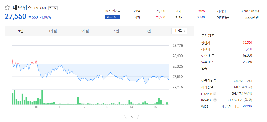 이 글에서는 네오위즈 주가 전망과 목표 주가, 기업 정보에 대해서 설명합니다. 주식 시장에서 중요한 것은 미래의 기업 가치를 예측하고 선제적으로 움직이는 것입니다. 투자할 종목을 고르기 전에 현재 기업의 현황과 데이터를 확인하는 것이 필요합니다. 네오위즈 주식의 주요 현황과 투자 정보를 확인하시고 주식 투자에 도움이 될 만한 정보들을 모아 놓았으니 투자 시 참고하시기 바랍니다..