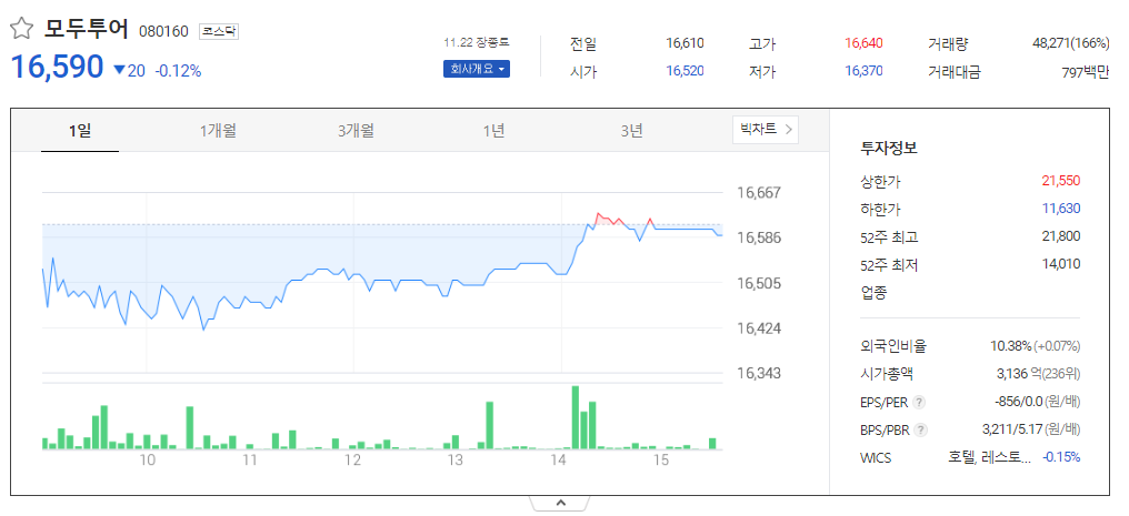 모두투어 현재 주가는 16,610원이며 전일 대비 -10원의 모습을 보이고 있습니다. 모두투어의 주주현황을 살펴보면 우종웅(외 7인)이 지분 11.26%를 소유하고 있습니다. 모두투어는 호텔 및 레저 기업으로 장중 기준으로 주가는 16,610원 입니다. 모두투어 시가 총액은 3136억 원이며 발행 주식수는 10.38주 입니다. 외국인 보유 비중은 29,042% 이며 장중 거래량은 18,900,000를 기록했습니다. 매출액은 813억 원, 영업이익은 -163억 원을 달성했습니다. EPS는 746원이며 모두투어 주식 배당수익률은 0.72% 입니다.