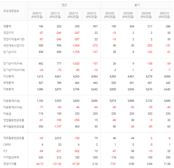 -2023년 9월 전년동기 대비 연결기준 매출액은 290.8% 증가, 영업손실은 94.9% 감소, 당기순손실은 88.9% 감소. 온라인 게임 ‘이터널 리턴’의 인기 반등 중. 앞서 3년간의 얼리 액세스를 마치고 최근 정식 서비스를 시작함. 게임 개발사 마그넷, 마케팅 및 광고업체 리메이크디지털, 시스템 및 소프트웨어 개발·공급업체 애드엑스플라가 합병 대상. 자회사 합병을 통해 사업 고도화가 이뤄질 것으로 기대.