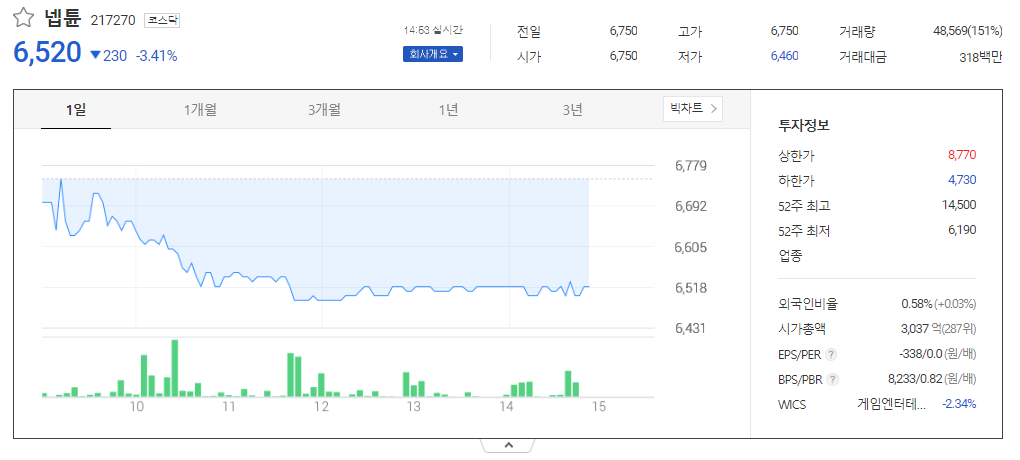 넵튠 현재 주가는 6,750원이며 전일 대비 -2.03원의 모습을 보이고 있습니다. 넵튠의 주주현황을 살펴보면 카카오게임즈 주주가 전체 지분 48.25%를 소유하고 있습니다. 넵튠는 게임 소프트웨어 기업으로 장중 기준으로 주가는 6,750원 입니다. 넵튠의 시가 총액은 3037억 원이며 발행 주식수는 46,582,150주 입니다. 외국인 보유 비중은 0.58% 이며 장중 거래량은 32,114원 을 기록했습니다. 매출액은 997억 원을 달성했습니다. 넵튠 주식 배당수익률은 0.78% 입니다.