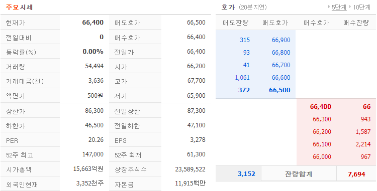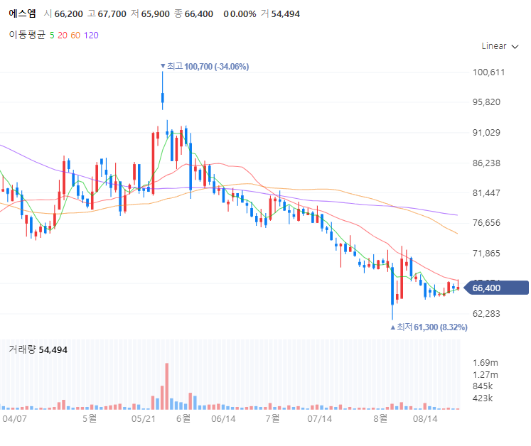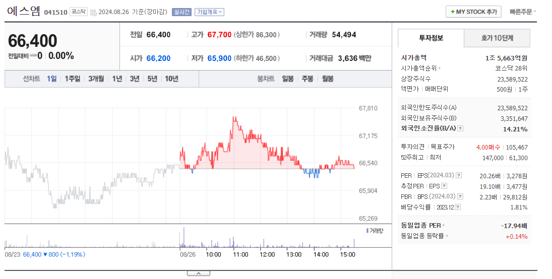 에스엠의 현재 주가는 66,400원입니다. 전일 대비 -800원 이동한 모습입니다. 시가 총액은 1조5663억 원이며 발행 주식은 총 23,353,627주 입니다. 외국인이 보유한 비중은 14.21%입니다. 에스엠 기업의 영업이익은 억 원을 달성했으며 배당 수익율은 1.30% 입니다.
