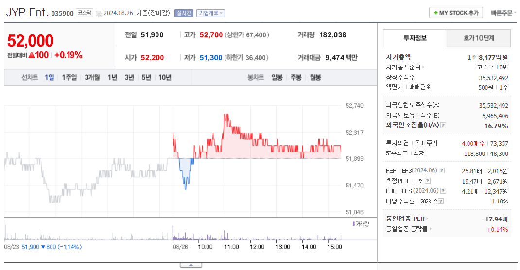 단기 포트폴리오를 구성할 때는 시가 총액과 장중 거래량도 확인해야 합니다. JYP Ent.의 시가 총액은 1조8477억 원이며 장중 거래량은 205,384원 을 기록했습니다. 대주주의 정보는 중요하지 않을 수 있지만 장기적으로는 확인해보는 것이 좋겠습니다.