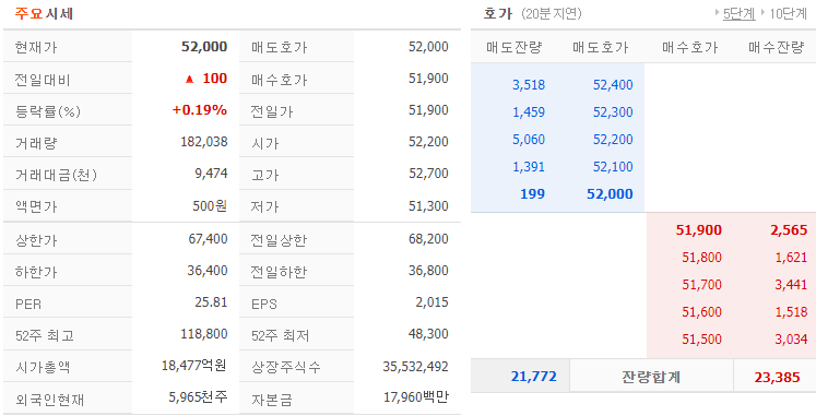 JYP Ent.의 현재 주가는 51,900원입니다. 전일 대비 -600원 이동한 모습입니다. 시가 총액은 1조8477억 원이며 발행 주식은 총 35,532,492주 입니다. 외국인이 보유한 비중은 16.79%입니다. JYP Ent. 기업의 영업이익은 억 원을 달성했으며 배당 수익율은 18,441% 입니다.
