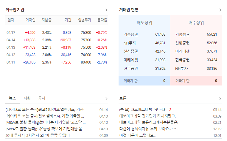 제일 좋은 경우는 외국인과 기관이 같이 매수하는 쌍끌이 종목을 집중적으로 공략하는 것입니다. 기관과 외국인이 같이 매수하는 것은 좋은 종목이라는 뜻입니다. 해당 종목의 주가 전망을 알아보려면 기업 정보를 분석하고 시장 흐름에서의 위치를 파악해야 합니다. 거기에 외국인과 기관 매수 매도까지 찾아본다면 수익을 낼 확률을 올리는 것이 가능합니다.