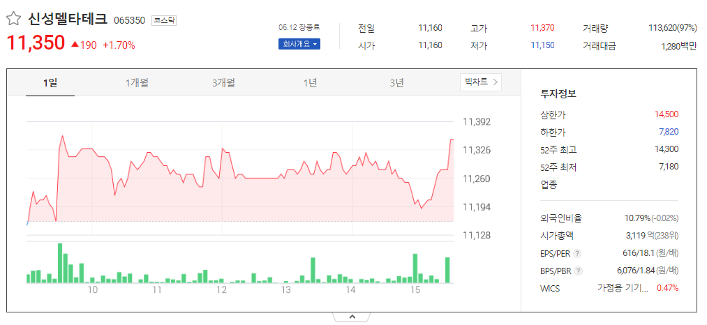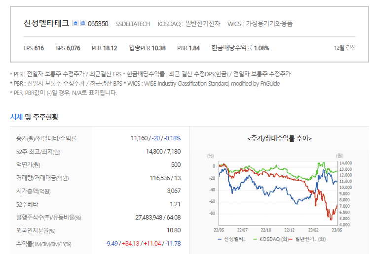 신성델타테크 현재 주가는 11,160원이며 전일 대비 -20원의 모습을 보이고 있습니다. 신성델타테크의 주주현황을 살펴보면 구본상(외 8인)이 지분 34.07%를 소유하고 있습니다. 신성델타테크는 내구소비재 기업으로 장중 기준으로 주가는 11,160원 입니다. 삼성전자의 시가 총액은 3108억 원이며 발행 주식수는 10.79주 입니다. 외국인 보유 비중은 116,536% 이며 장중 거래량은 27,483,948를 기록했습니다. 매출액은 7,934억 원, 영업이익은 350억 원을 달성했습니다. EPS는 1,019원이며 신성델타테크 주식 배당수익률은 0.65% 입니다.
