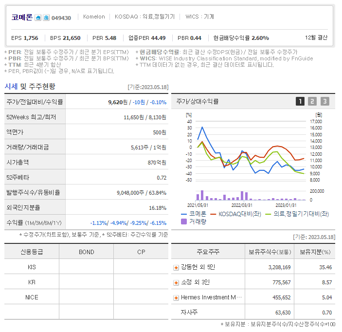 코메론 현재 주가는 9,620원이며 전일 대비 -10원의 모습을 보이고 있습니다. 코메론의 주주현황을 살펴보면 강동헌(외 5인)이 지분 35.46%를 소유하고 있습니다. 코메론는 기계 기업으로 장중 기준으로 주가는 9,620원 입니다. 삼성전자의 시가 총액은 866억 원이며 발행 주식수는 16.18주 입니다. 외국인 보유 비중은 5,613% 이며 장중 거래량은 9,048,000를 기록했습니다. 매출액은 827억 원, 영업이익은 166억 원을 달성했습니다. EPS는 없음원이며 코메론 주식 배당수익률은 % 입니다.