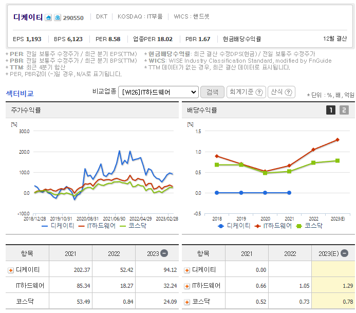 기업의 가치를 평가하는 방법은 여러 가지가 있지만 그 중 기술지표를 활용하는 방법을 소개드립니다. 디케이티는 전체 기술주 1,995개 기업 중 1,820위 등급인 하위 3.03%입니다. 대표 섹터 평가 66개 기업 중 64위 등급인 하위 3.03%입니다. 대표 테마 평가 20개 기업 중에서는 15위를 차지했습니다. 이를 바탕으로 투자 매력도를 평가해보면 전체 기술주 하위 10.88%, 대표 섹터 하위 1.52%, 대표 테마 17위의 결과를 얻을 수 있습니다. 동종분야 기업들의 평균적인 기술력 대비 주가에 비하여 현재 동사의 기술력 대비 주가는 고평가되어 있습니다.