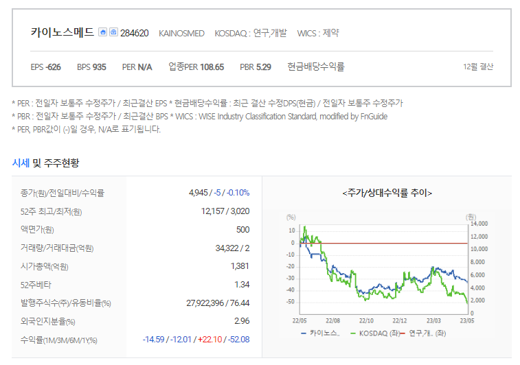 카이노스메드 현재 주가는 4,945원이며 전일 대비 -5원의 모습을 보이고 있습니다. 카이노스메드의 주주현황을 살펴보면 이기섭(외 18인)이 지분 22.51%를 소유하고 있습니다. 카이노스메드는 제약 기업으로 장중 기준으로 주가는 4,945원 입니다. 삼성전자의 시가 총액은 1379억 원이며 발행 주식수는 2.96주 입니다. 외국인 보유 비중은 34,322% 이며 장중 거래량은 27,922,396를 기록했습니다. 매출액은 1억 원, 영업이익은 -162억 원을 달성했습니다.
